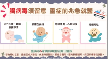 南市5家腸病毒責任醫院:成大醫院、永康奇美醫院、郭綜合醫院、臺南新樓醫院、麻豆新樓醫院。