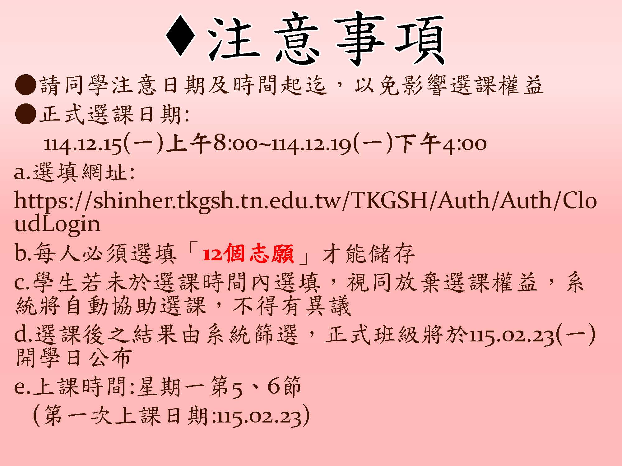 ¿若未於選課時間內選填,視同放棄選課權益,系統將自動協助選課,不得有異議〔12/15(一)08:00-12/19(五)下午4點鐘截止)〕