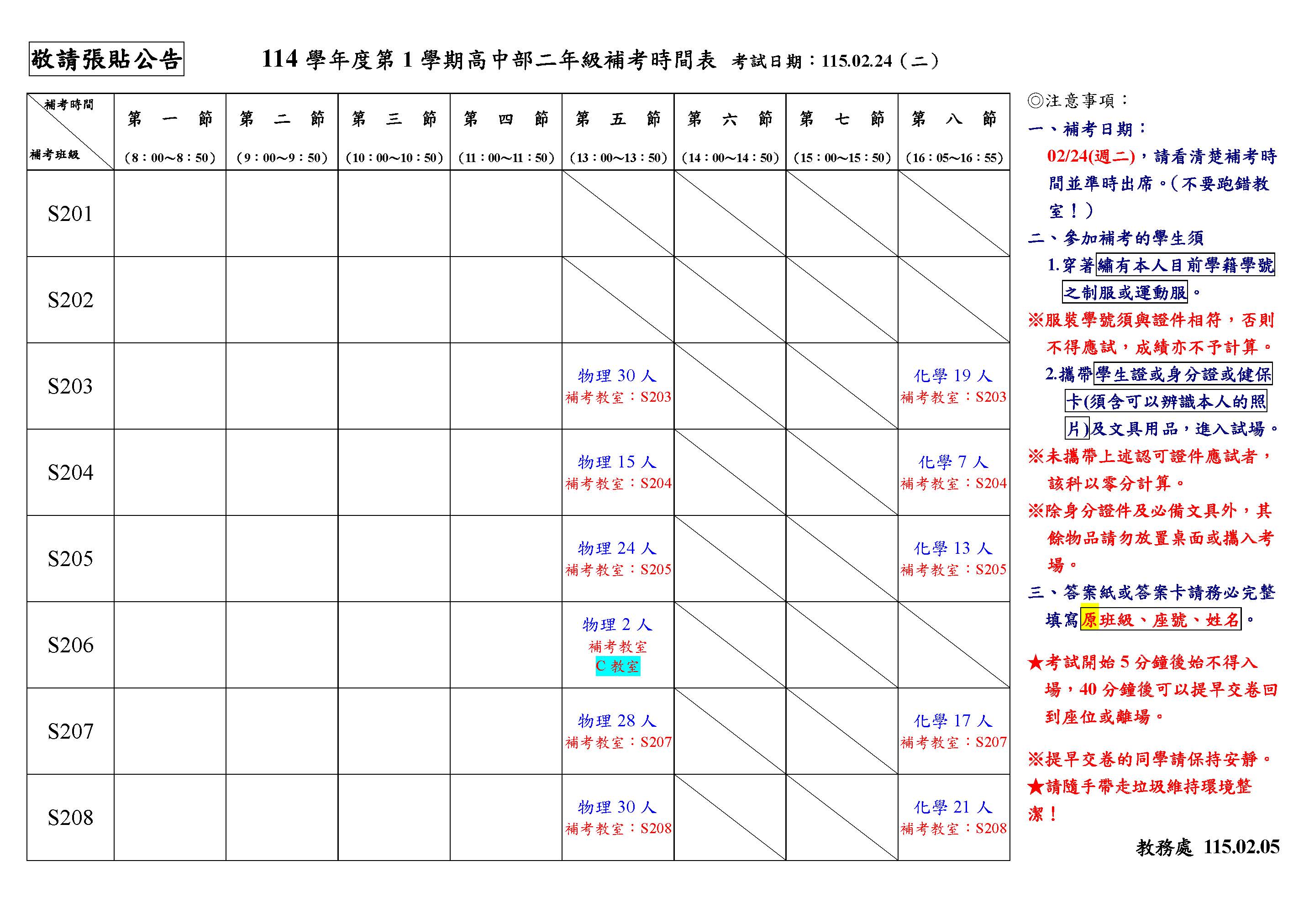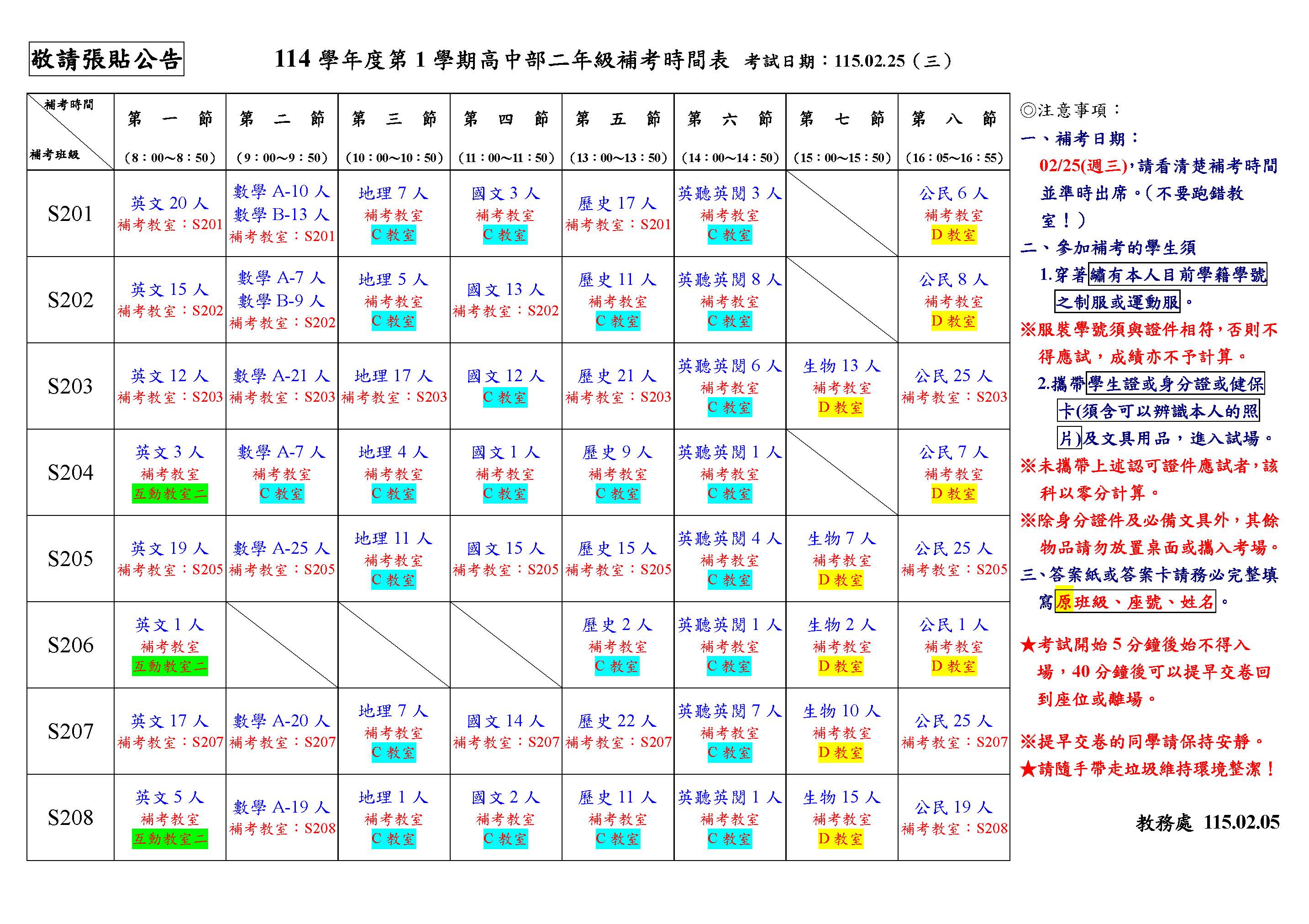 ¿高二(若有轉換組別或數學學程請依照「原高二之班級」查詢補考時間及地點)