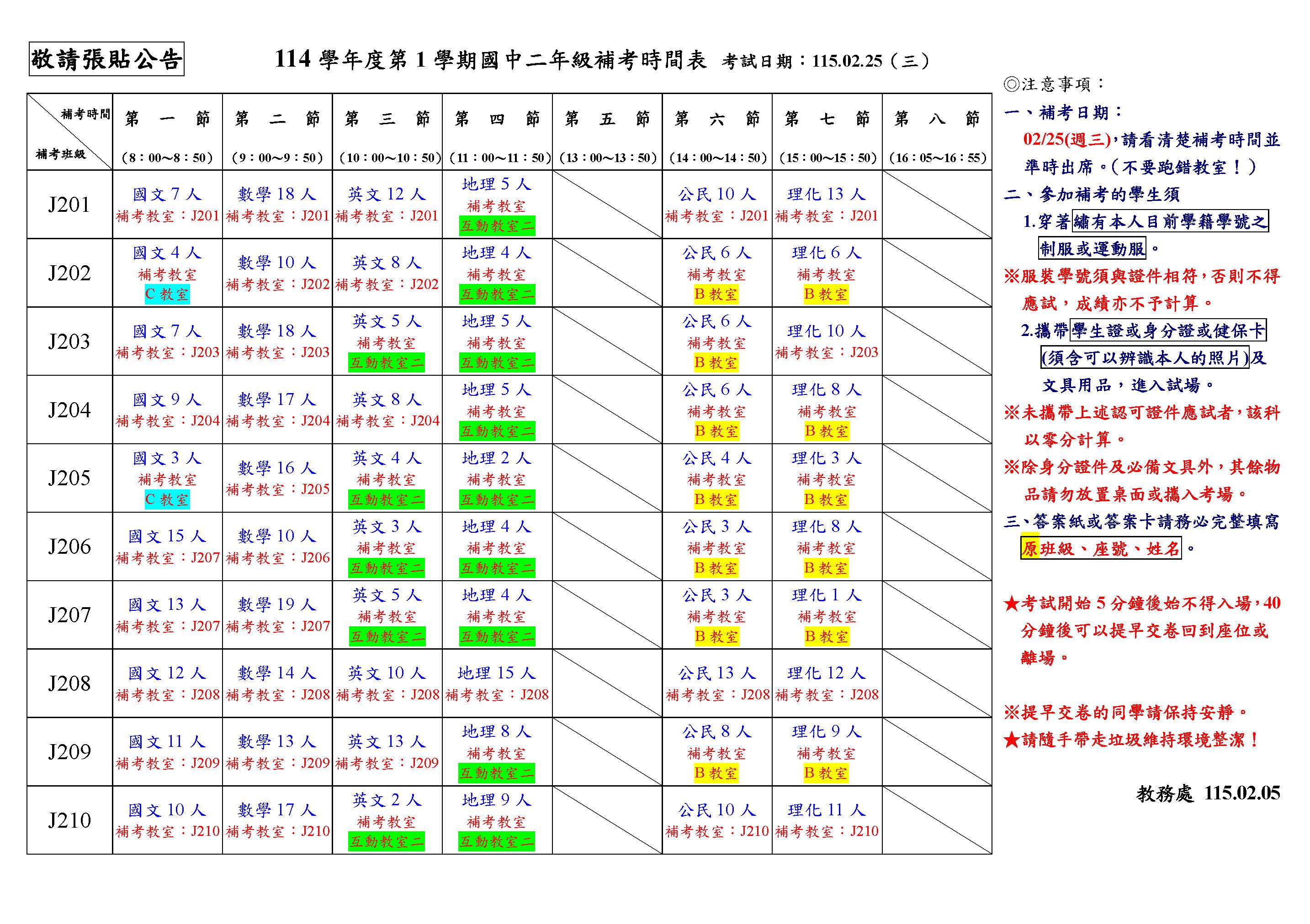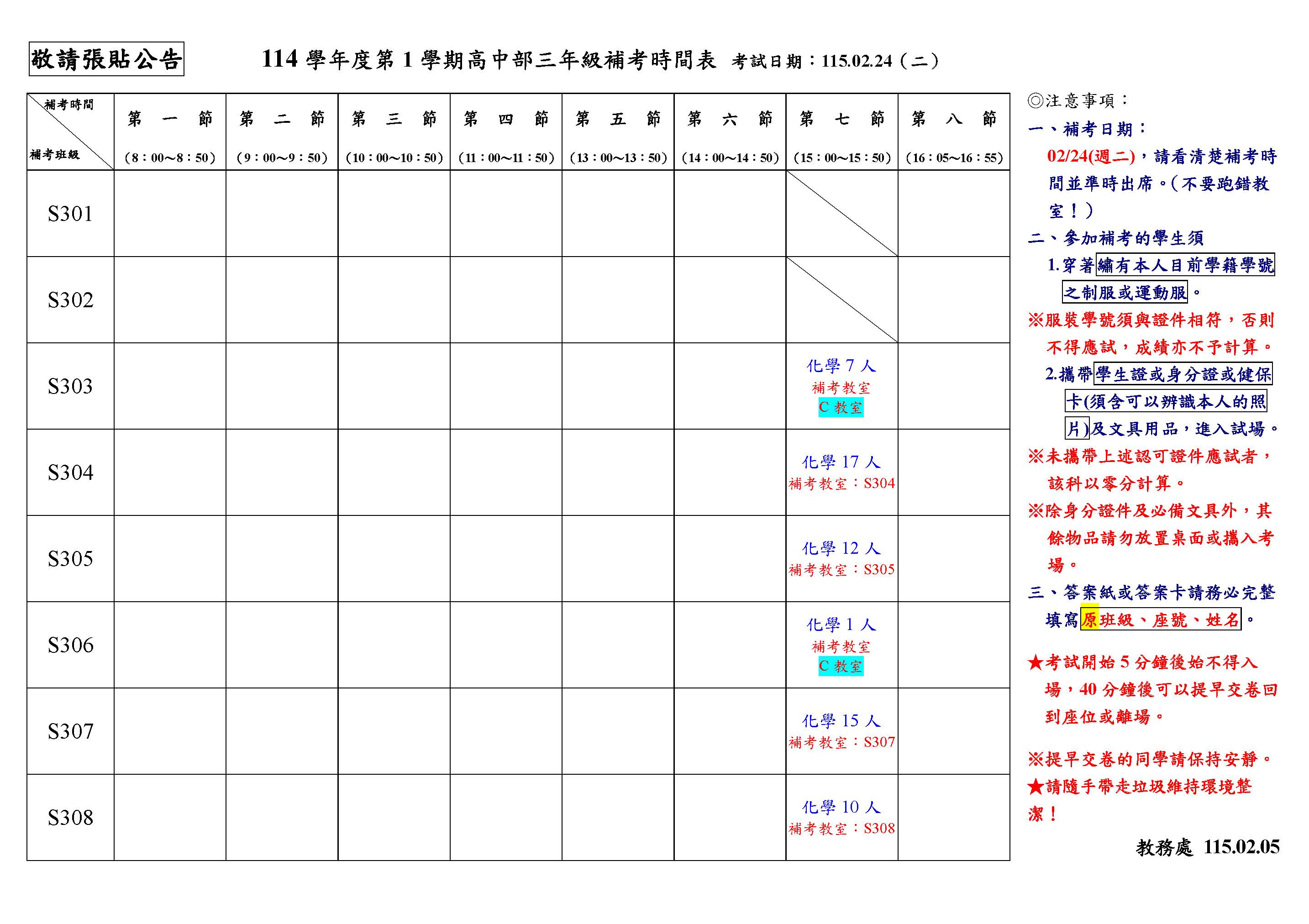 ★在原班教室補考的學生請留意:除身分證件及必備文具外,其餘物品請勿放置於桌面上,須放置於抽屜或教室後方置物櫃。若提早繳卷,請安靜回到座位,不可提早下課或離開教室。