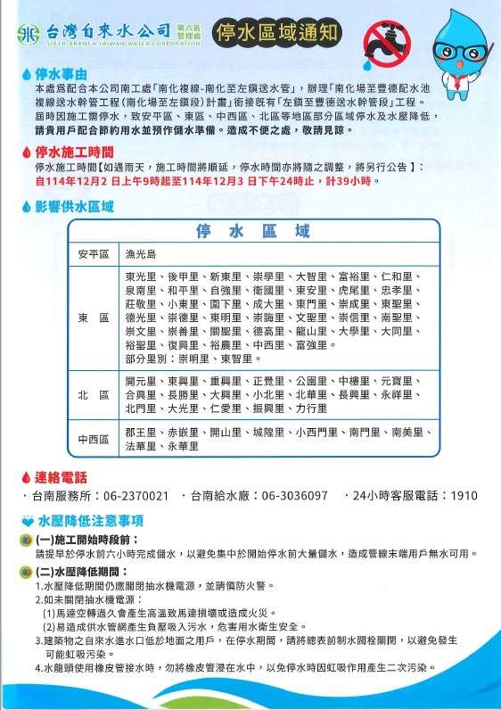 配合台灣自來水公司辦理(南化場至豐德配水池複線送水幹管工程),於114年12月2日上午9時至12月3日下午24時止,計停水39小時