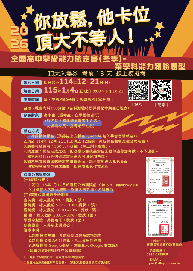 臺灣探究與實作教育學會舉辦「2026 全國高中學術能力檢定賽(冬季)類學科能力測驗題型」全國高中生競賽