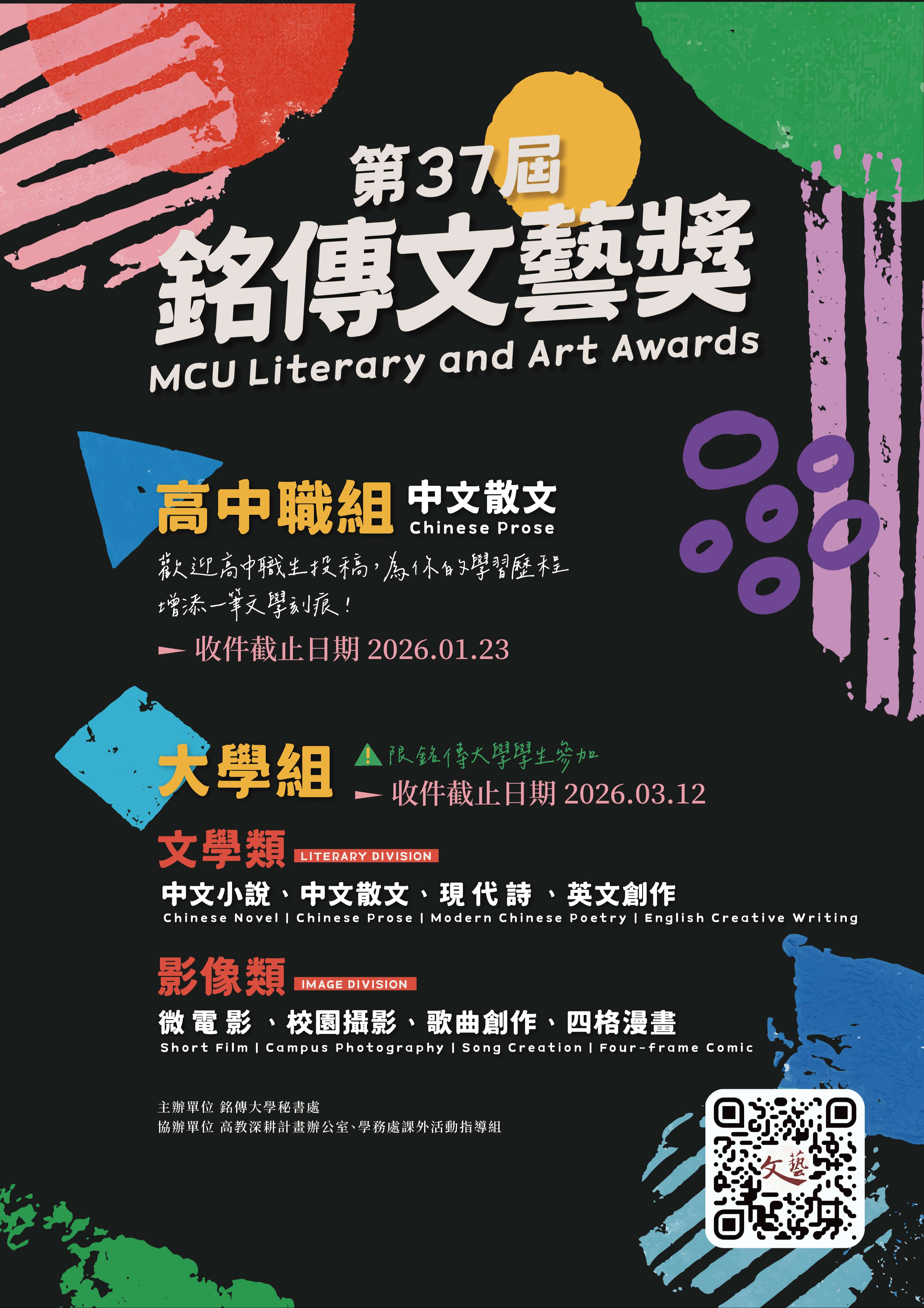 為提倡寫作風氣,提昇學生文學創作素養,培育文藝人才,銘傳大學主辦「第37屆銘傳文藝獎」,並設立高中職中文散文組。