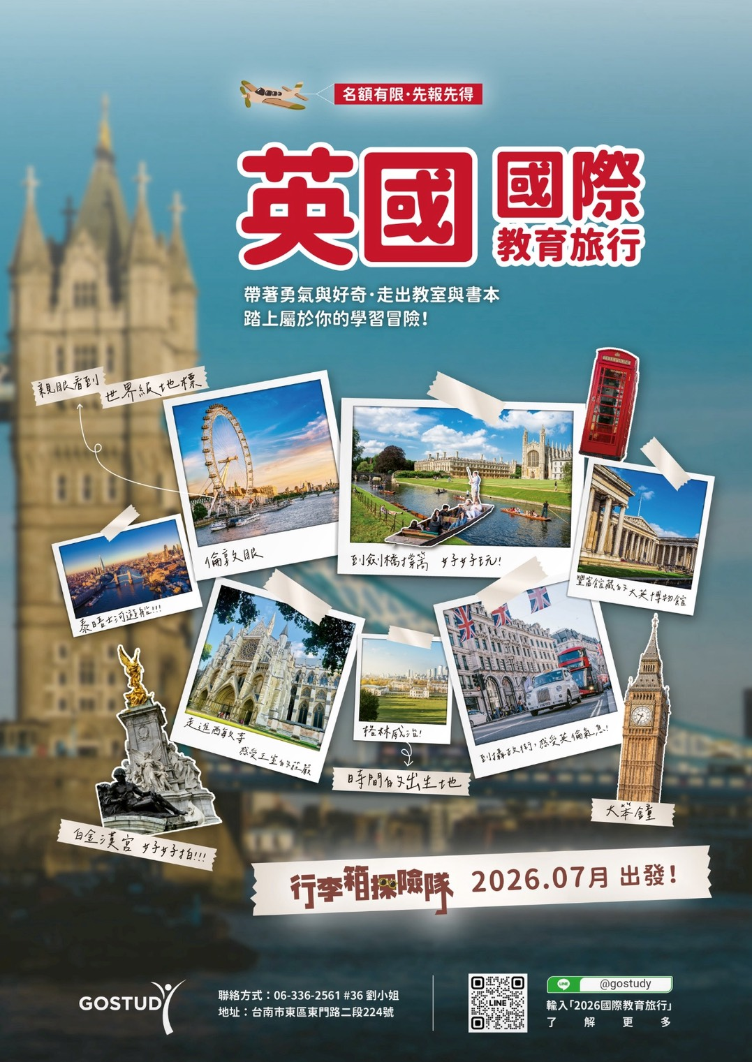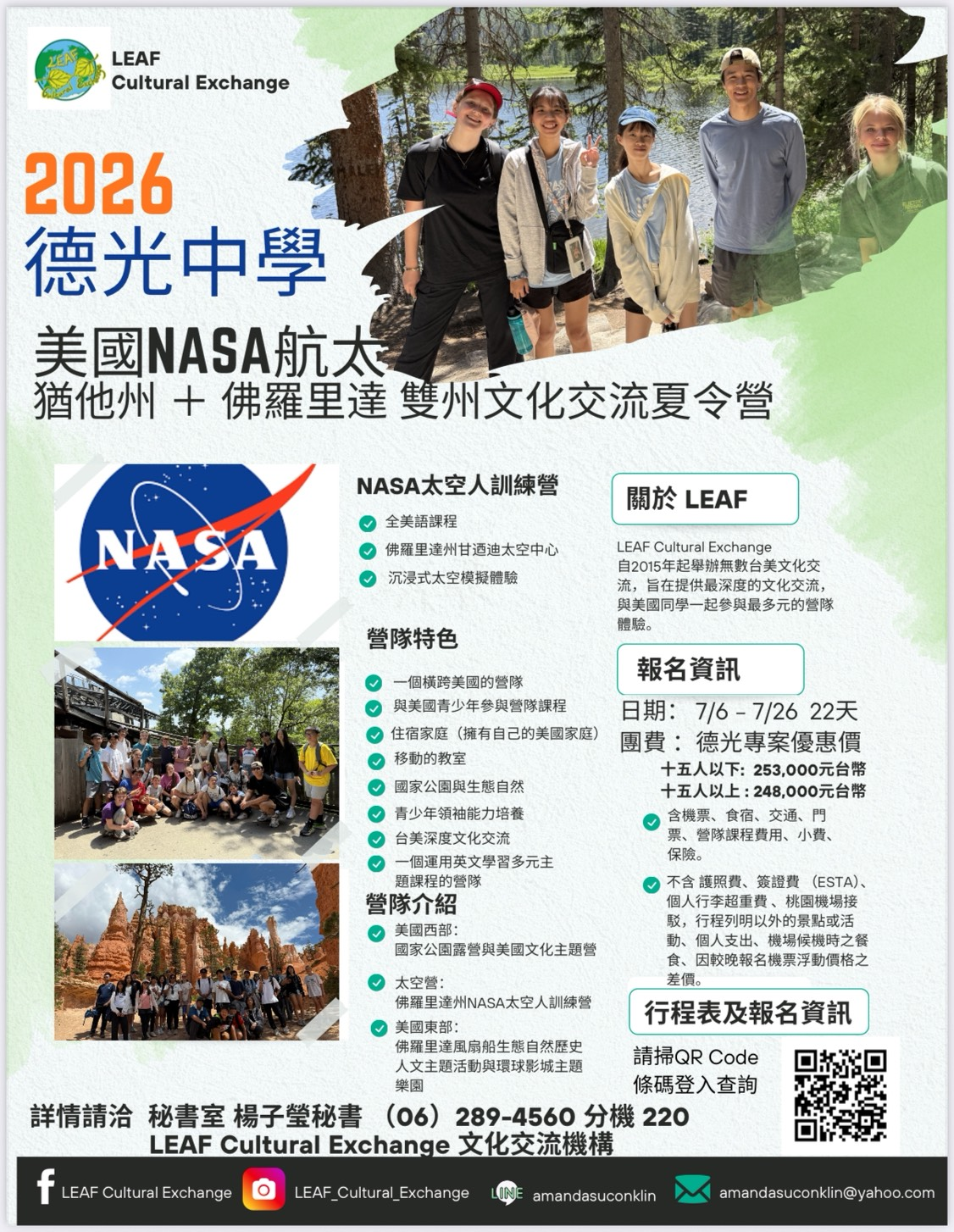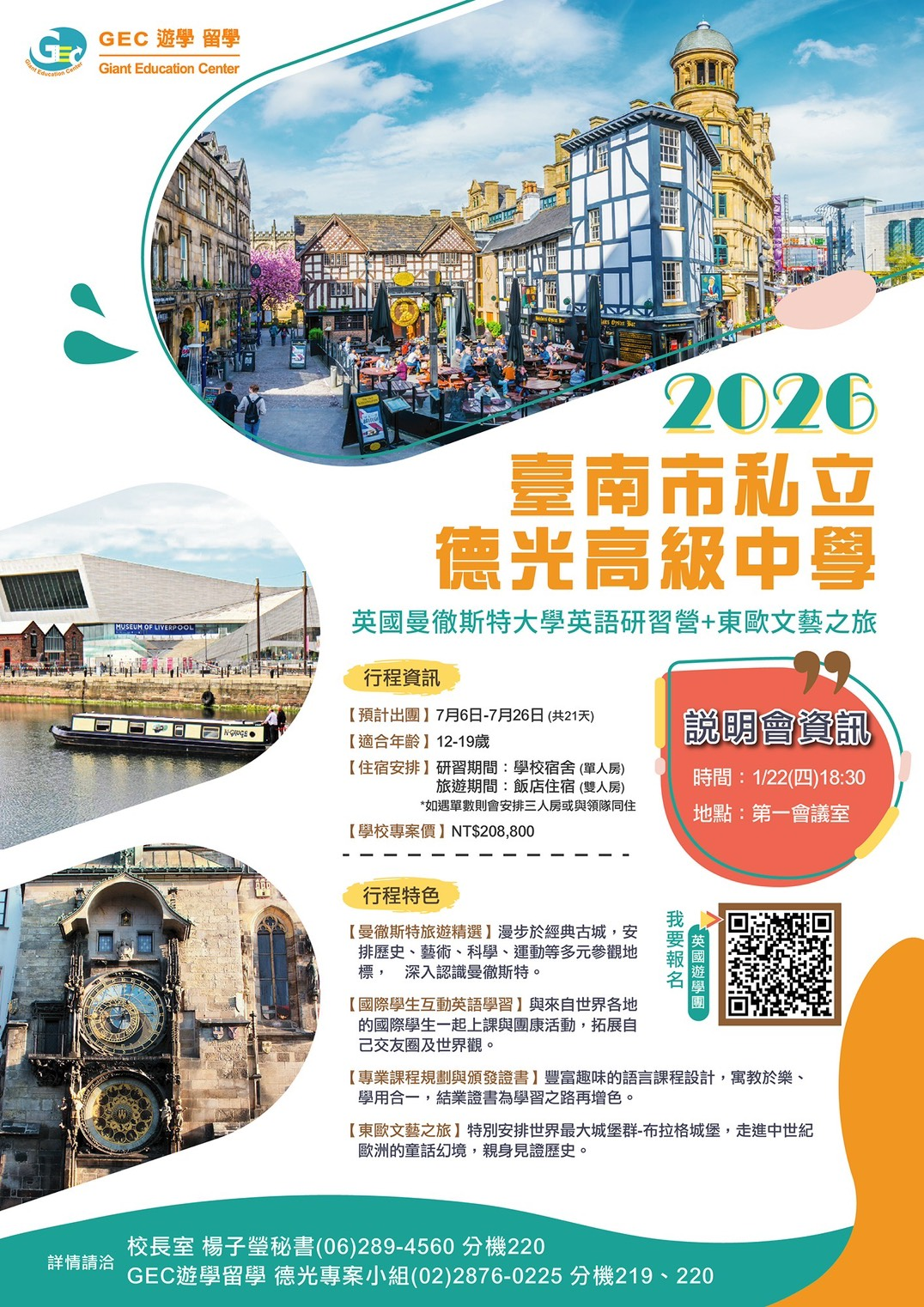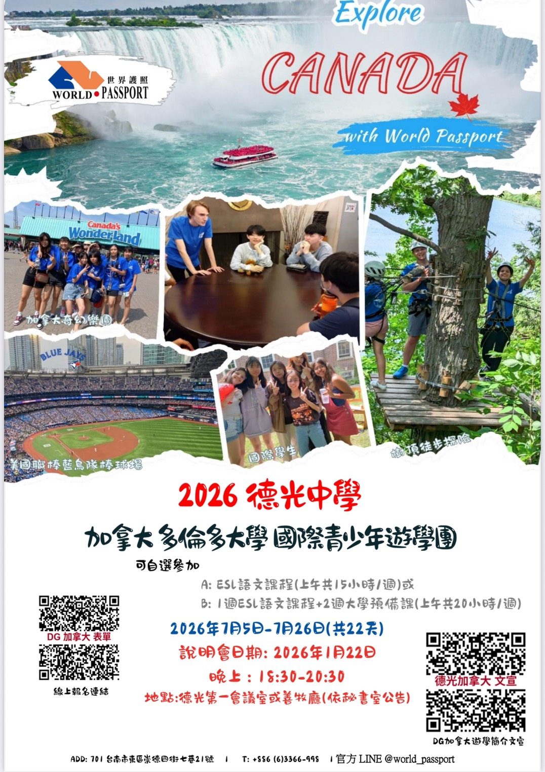 2026年,是否想給自己一個不一樣的暑假?倘佯中古世紀歐洲莊園或前進美國NASA太空總署;置身曼徹斯特瘋足球或為多倫多藍鳥隊歡呼叫好;挑戰森林露營或體驗寄宿家庭⋯⋯。德光為學生規劃了具有國際視野與文化交流的學習旅程~共有五個豐富精彩的遊學行程提供給大家!1/22(四)歡迎大家前來聆聽說明會。每團皆有亮點及特色,精彩內容,不容錯過!仔細比較過後再挑選自己最喜歡的行程,才不會有遺憾 ✨✈️