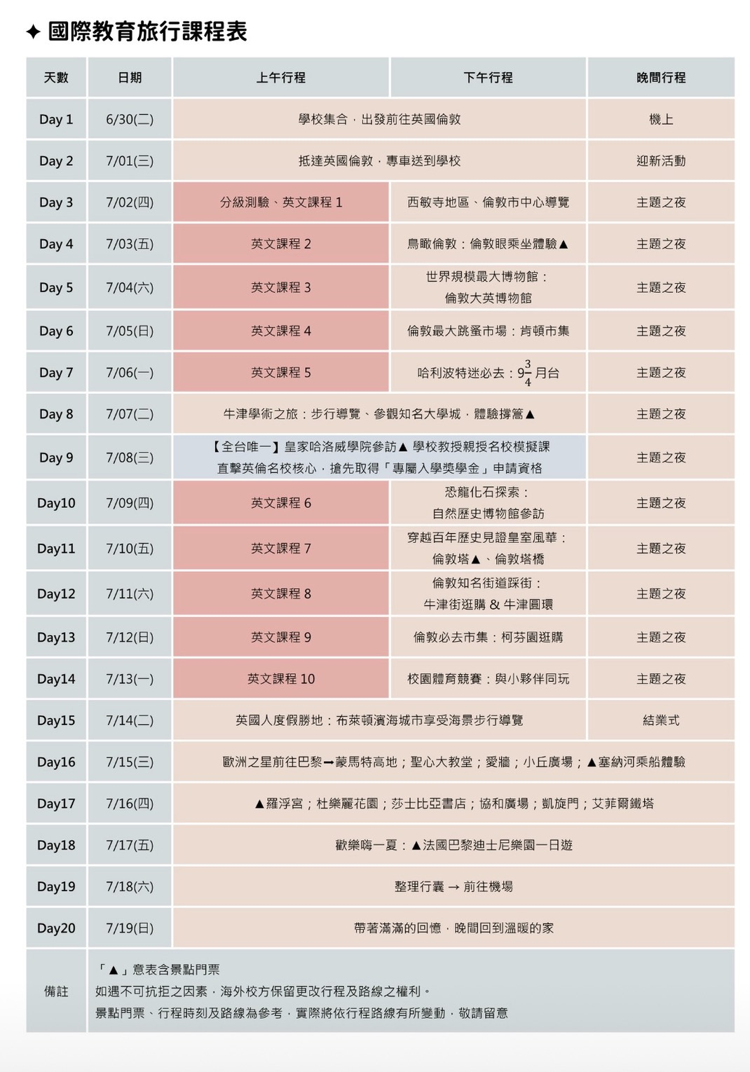 1. 英國國際教育旅行(英法團) | 6月30日~7月19日 |
