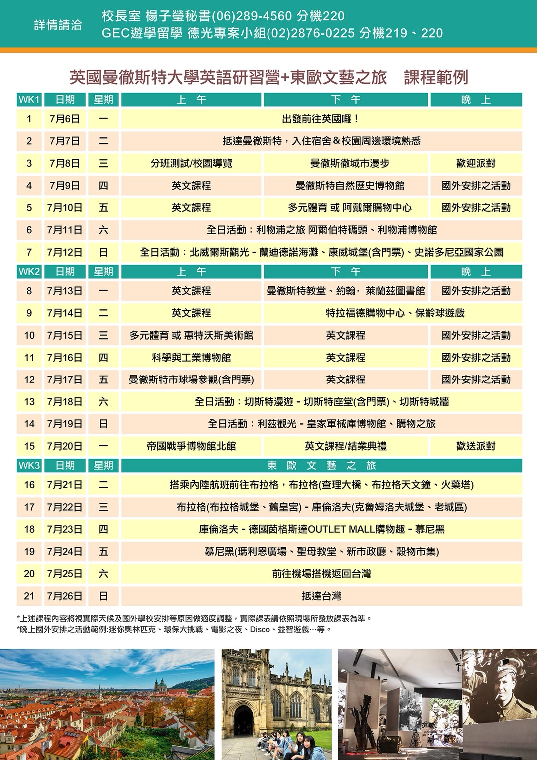 2. 英國曼徹斯特大學英語研習營+東歐文藝之旅 | 7月6日~7月26日 |